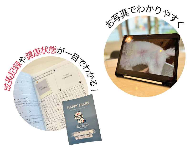 健康管理に関する気になる点は、お写真を添えてわかりやすくご説明します。カルテに記録することで、前回との変化や経過も一目で比較可能。施術後はトリミングレポートやハッピーダイアリーで、日々の健康状態を楽しく、そして安心して管理いただけます。